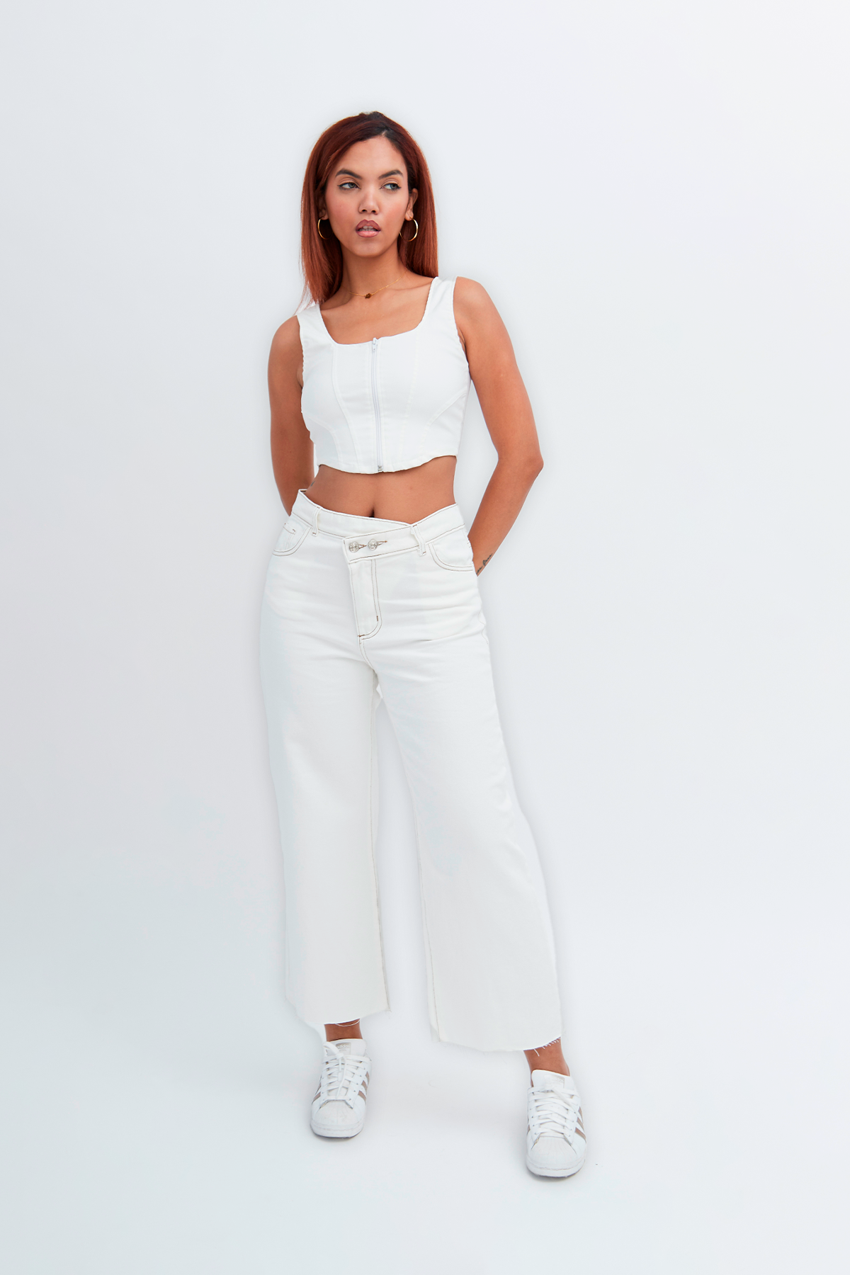 Pantalón wide leg, rígido, color crudo, largo hasta los tobillos, cintura con abotonadura diagonal y doble botón.