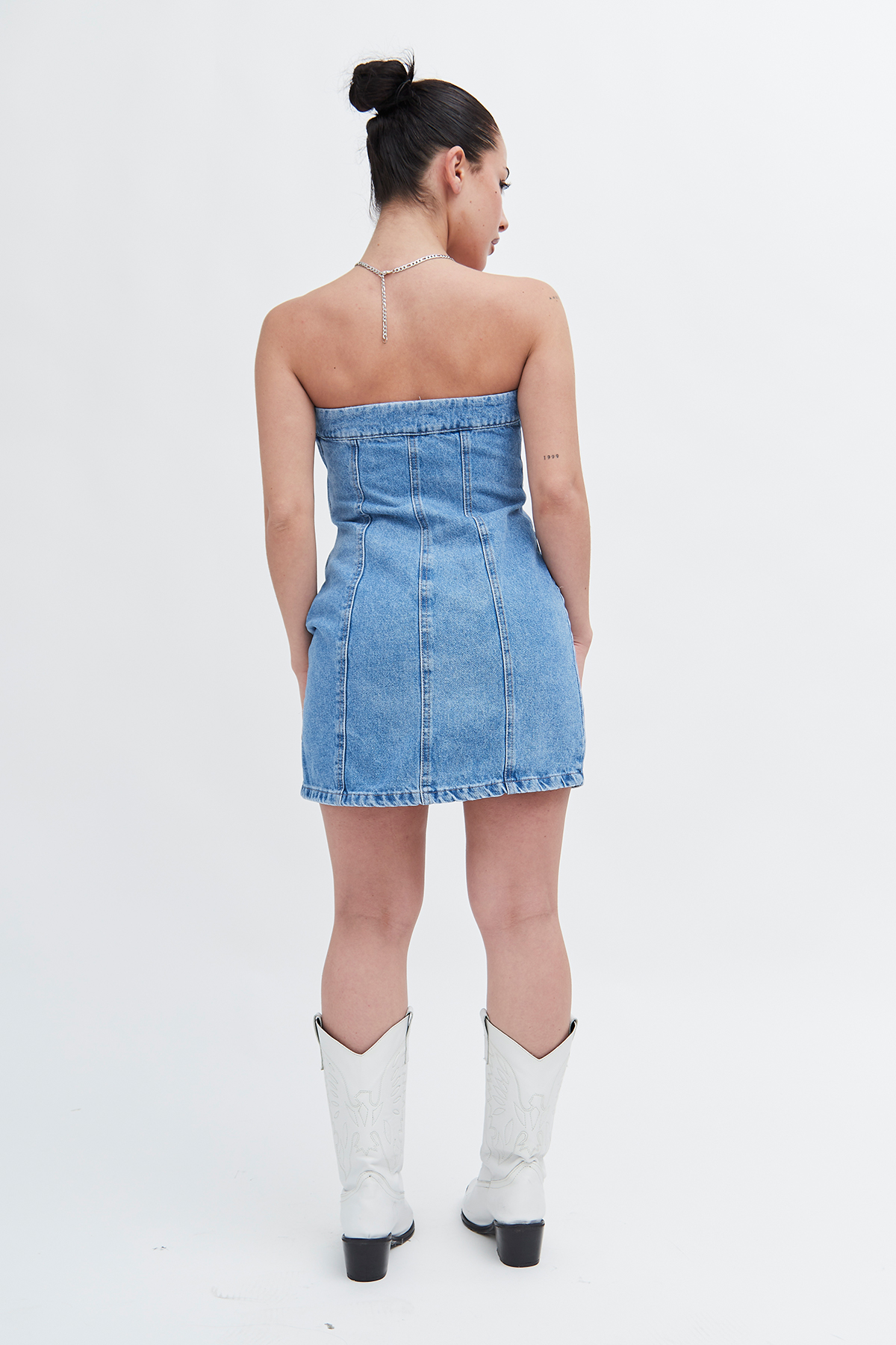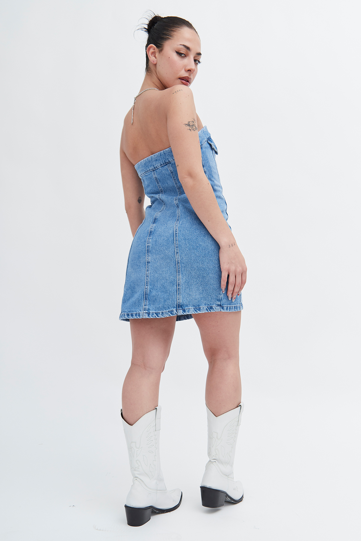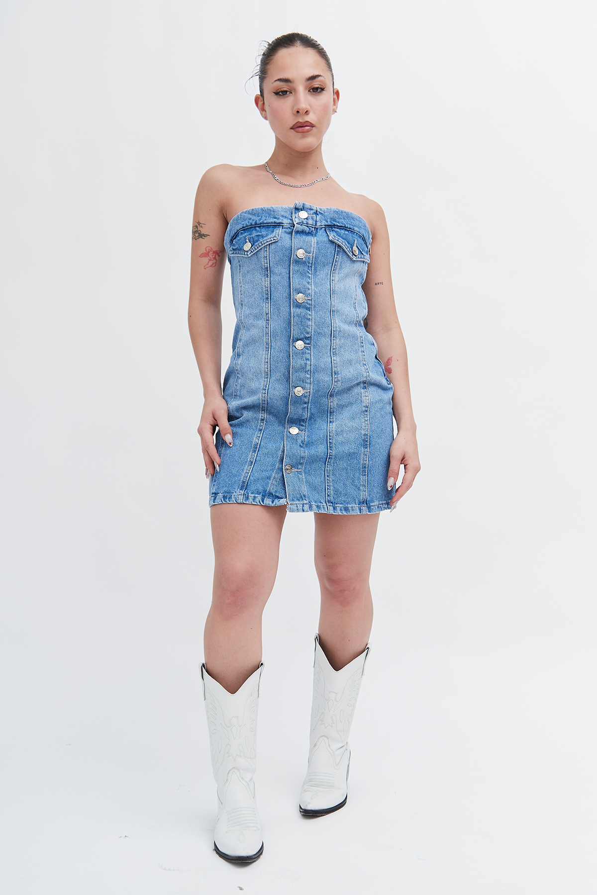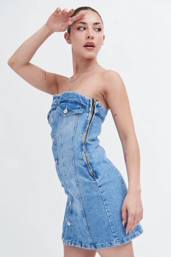 Vestido rígido, denim celeste, corto, strapless, con botones en el frente.