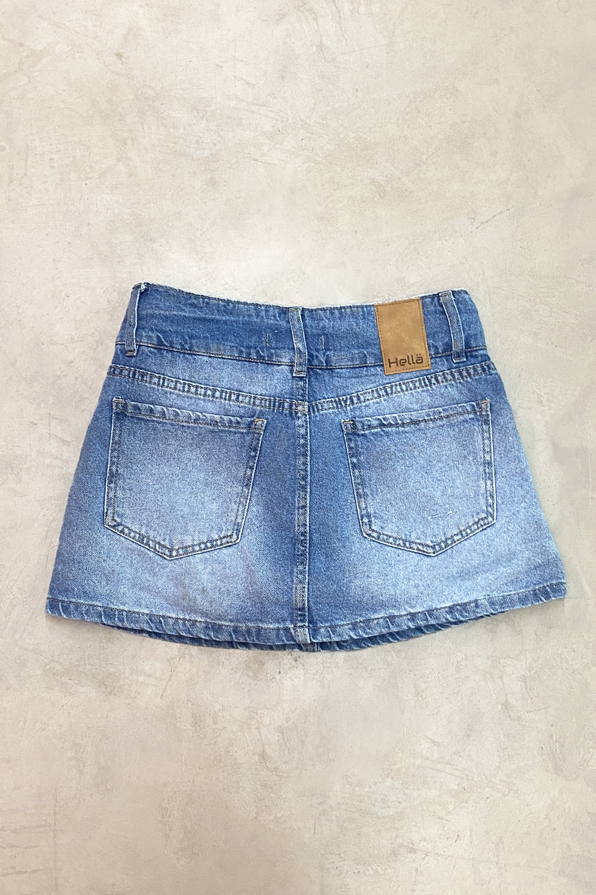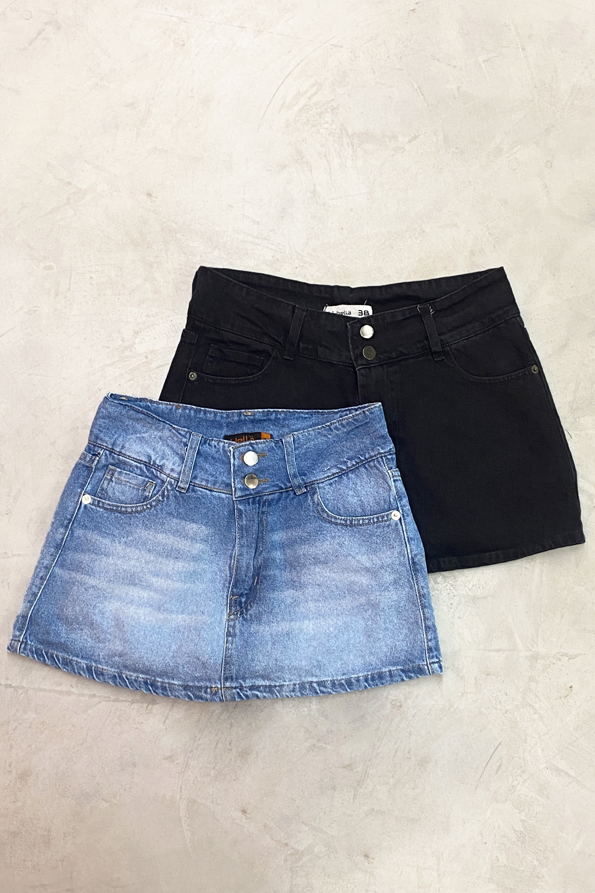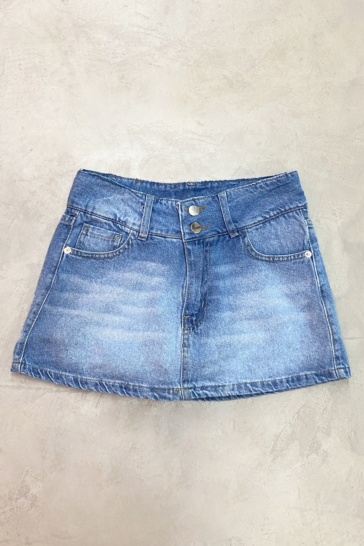 Short pollera denim rigido celeste localizado con 2 botones en la cintura.
