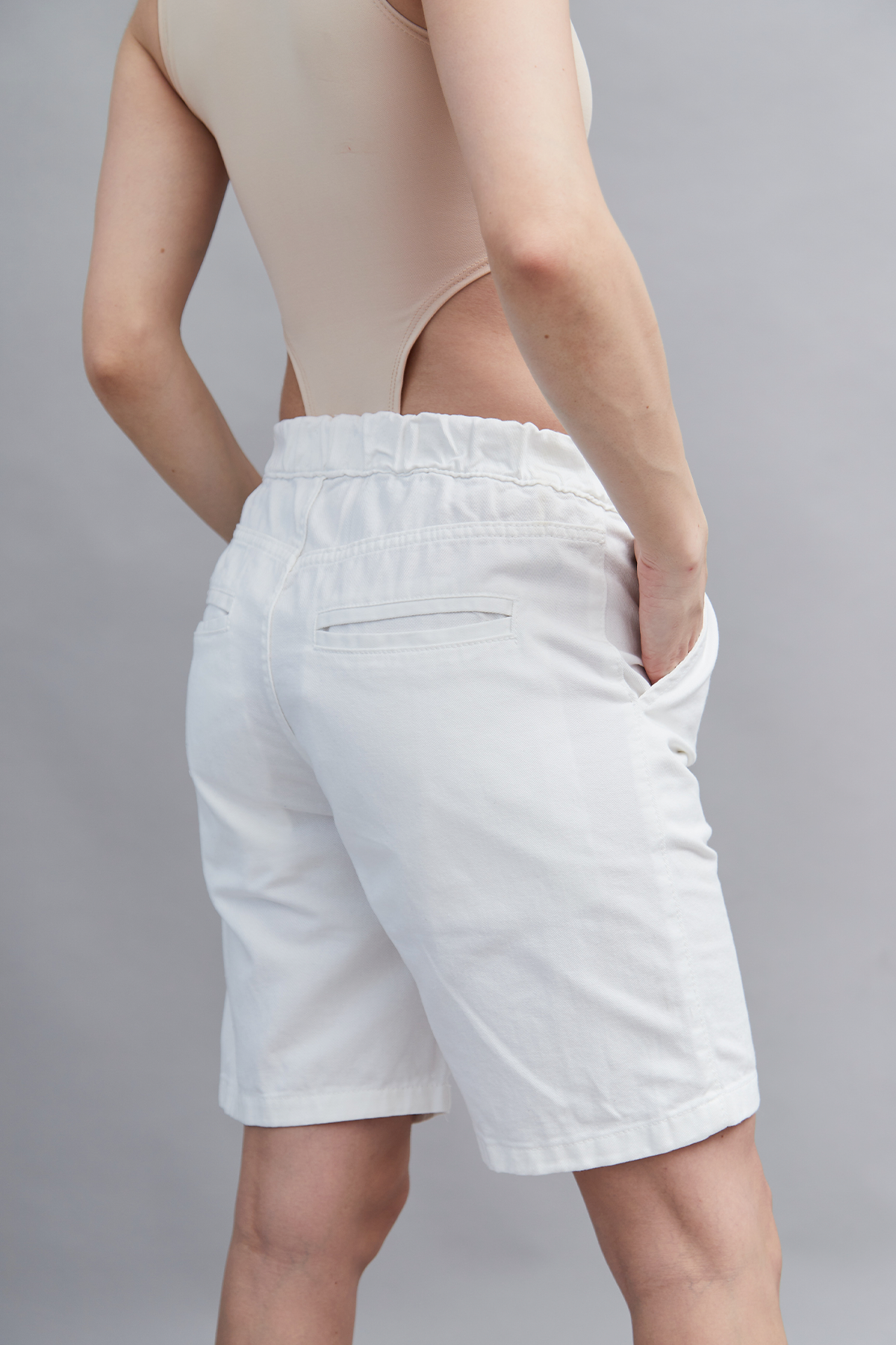 Bermuda jogger, blanca, rígida, tiro bajo.