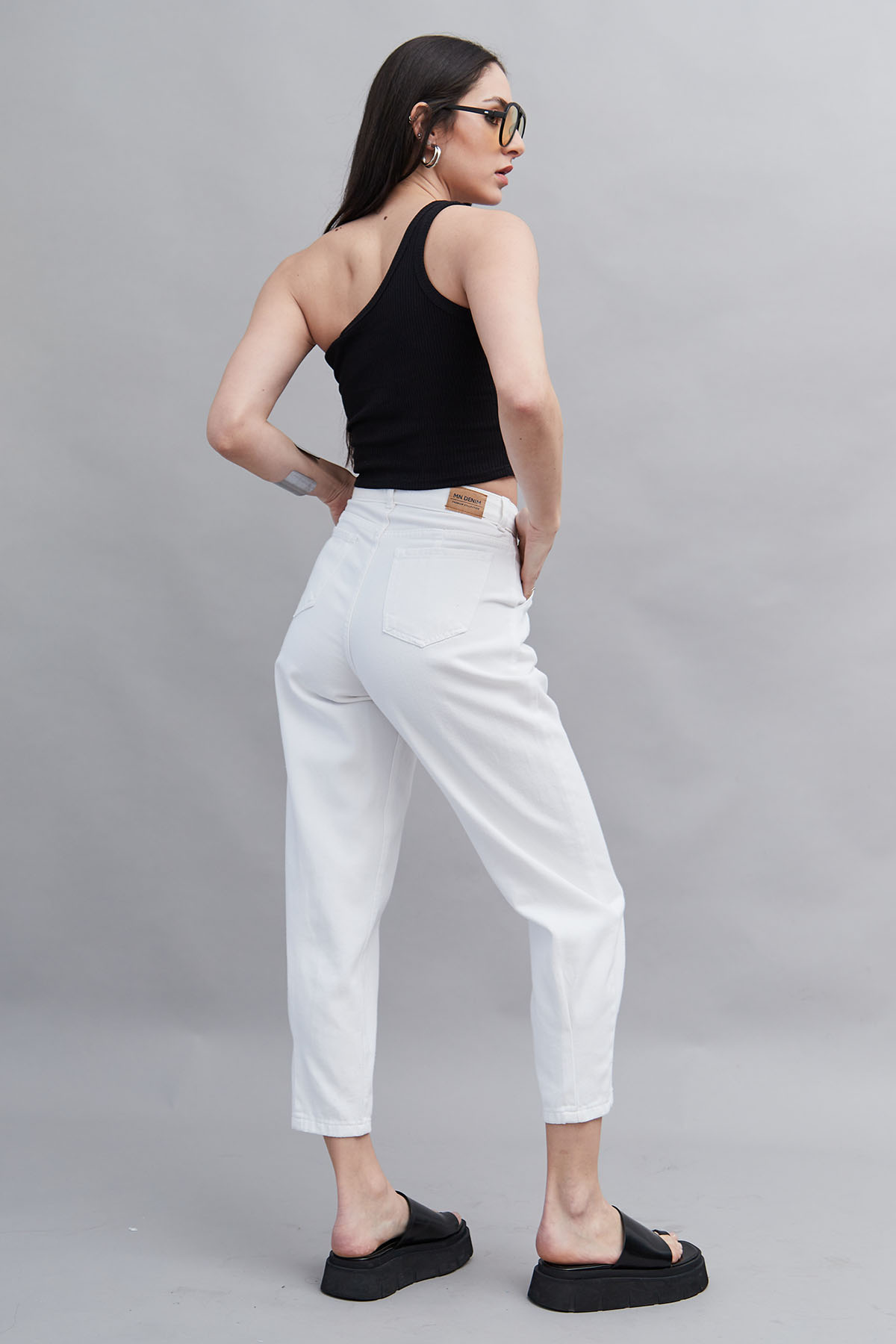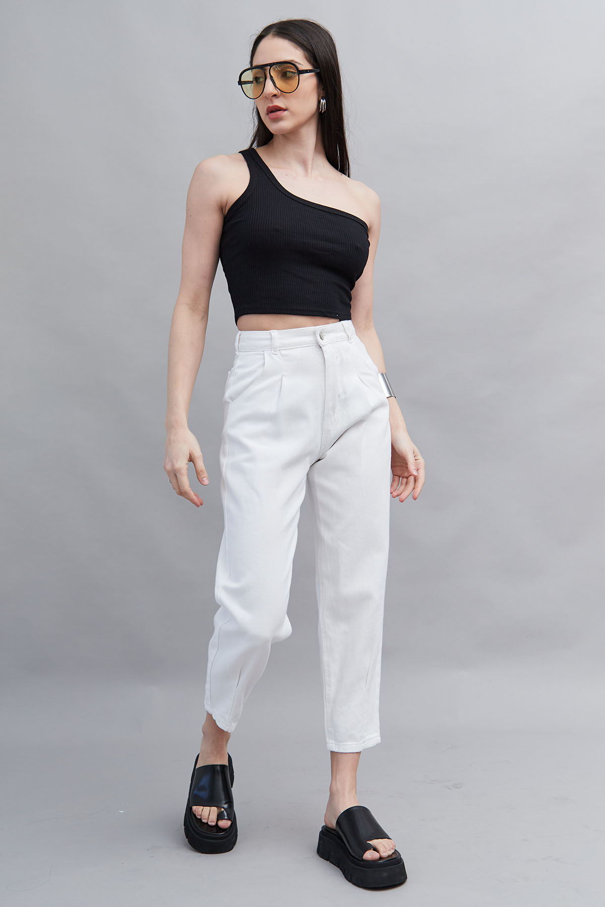 Pantalón mom blanco rígido con pinzas.