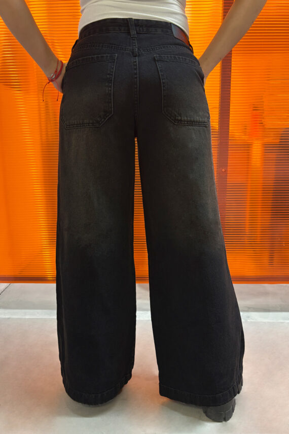 Pantalón wide leg rígido azul con localizado con strass en el frente, tiro bajo.