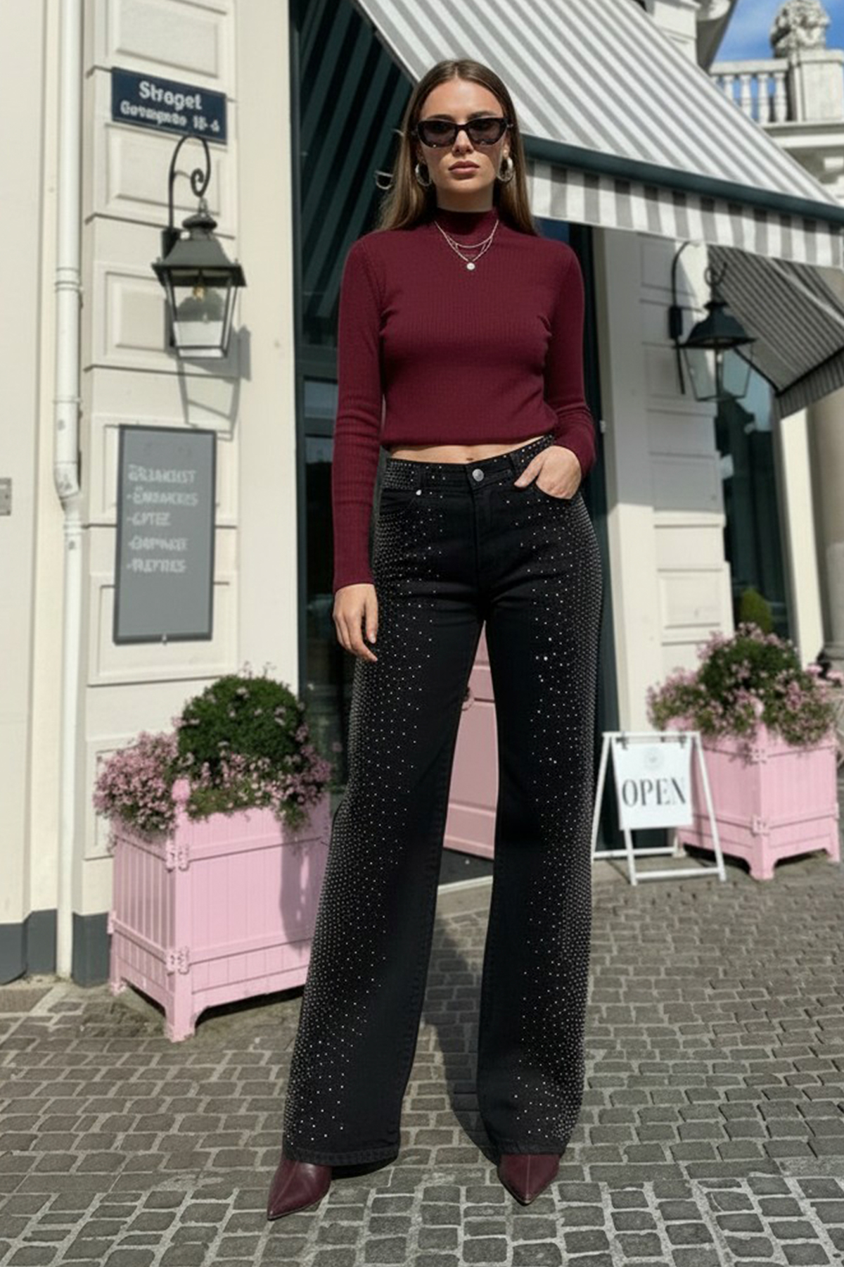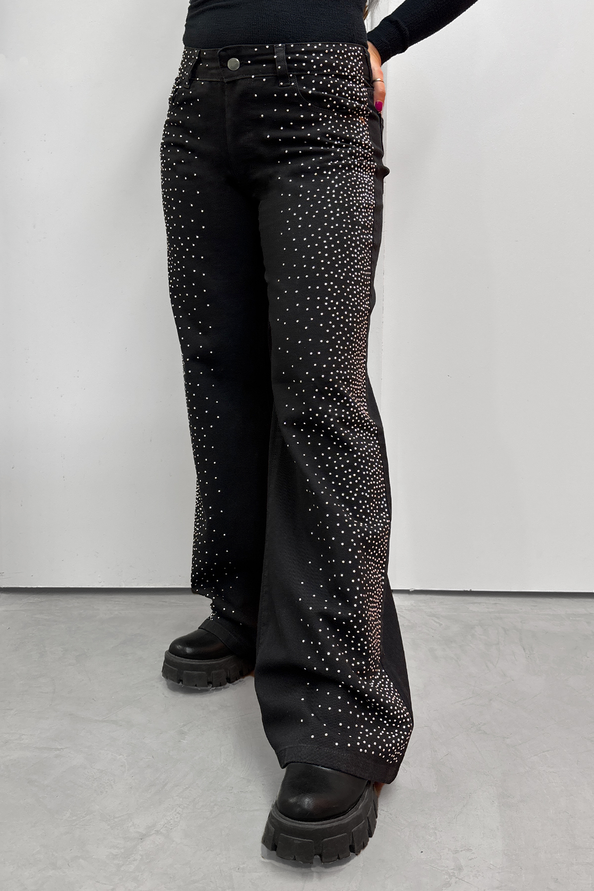 Pantalón wide leg rígido de gabardina negro con strass en el frente, tiro medio.