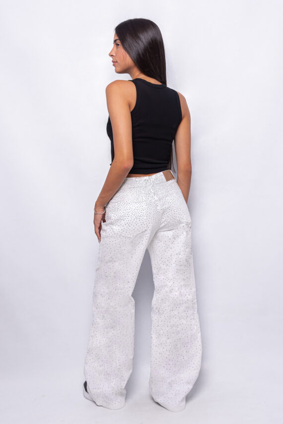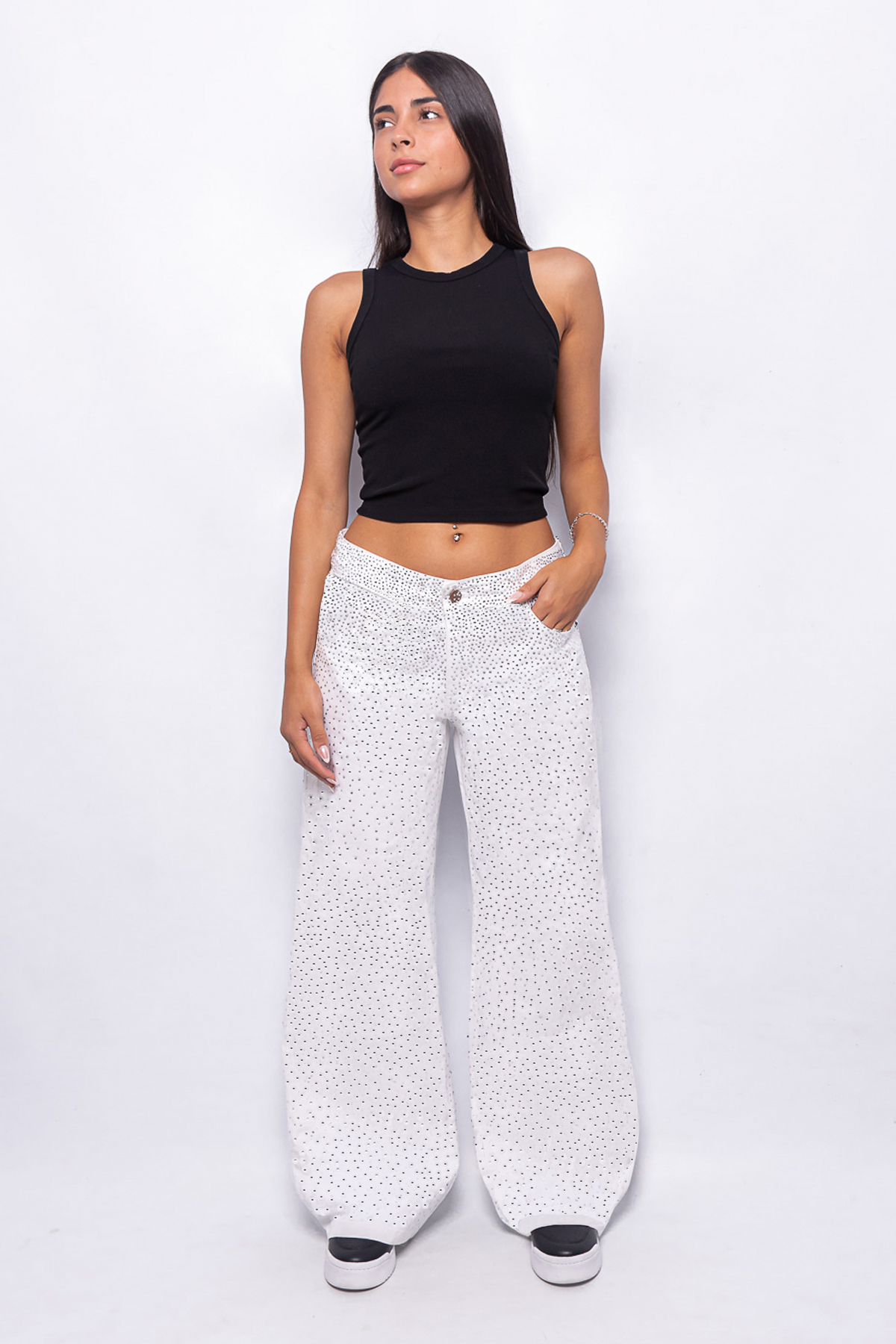 Wide leg rigido blanco, tiro medio con strass degrade completo adelante y atrás.