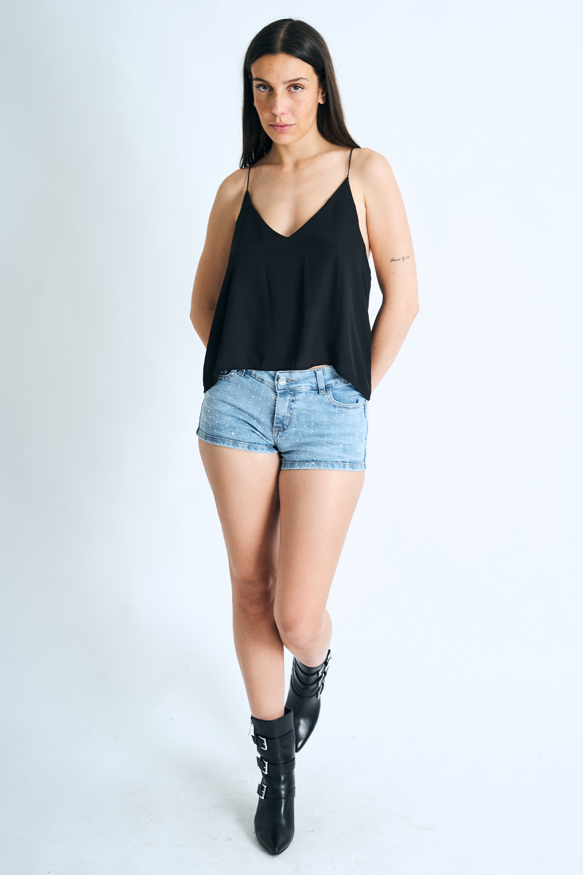 Short de jean elastizado celeste con strass en el frente, tiro bajo.