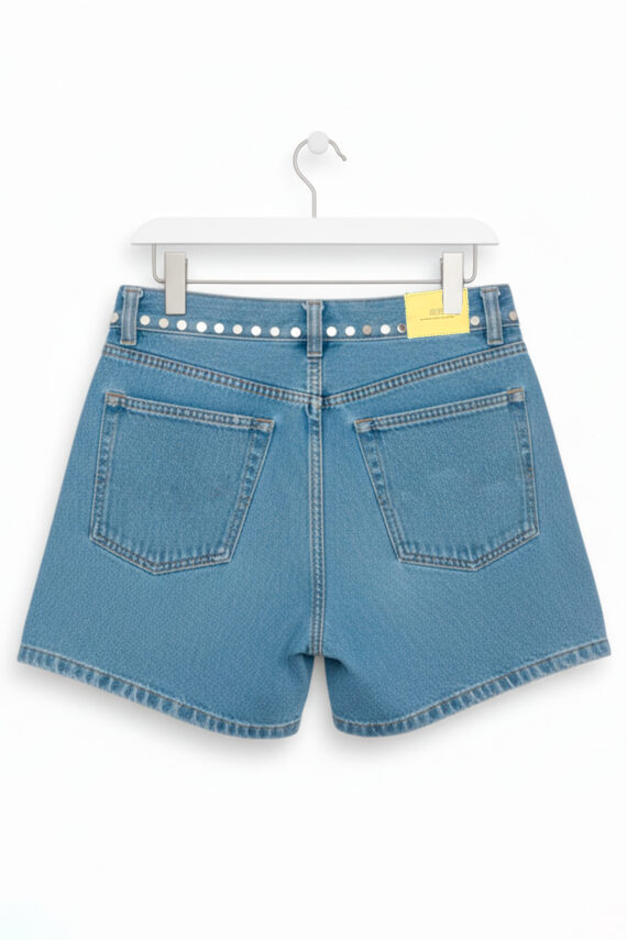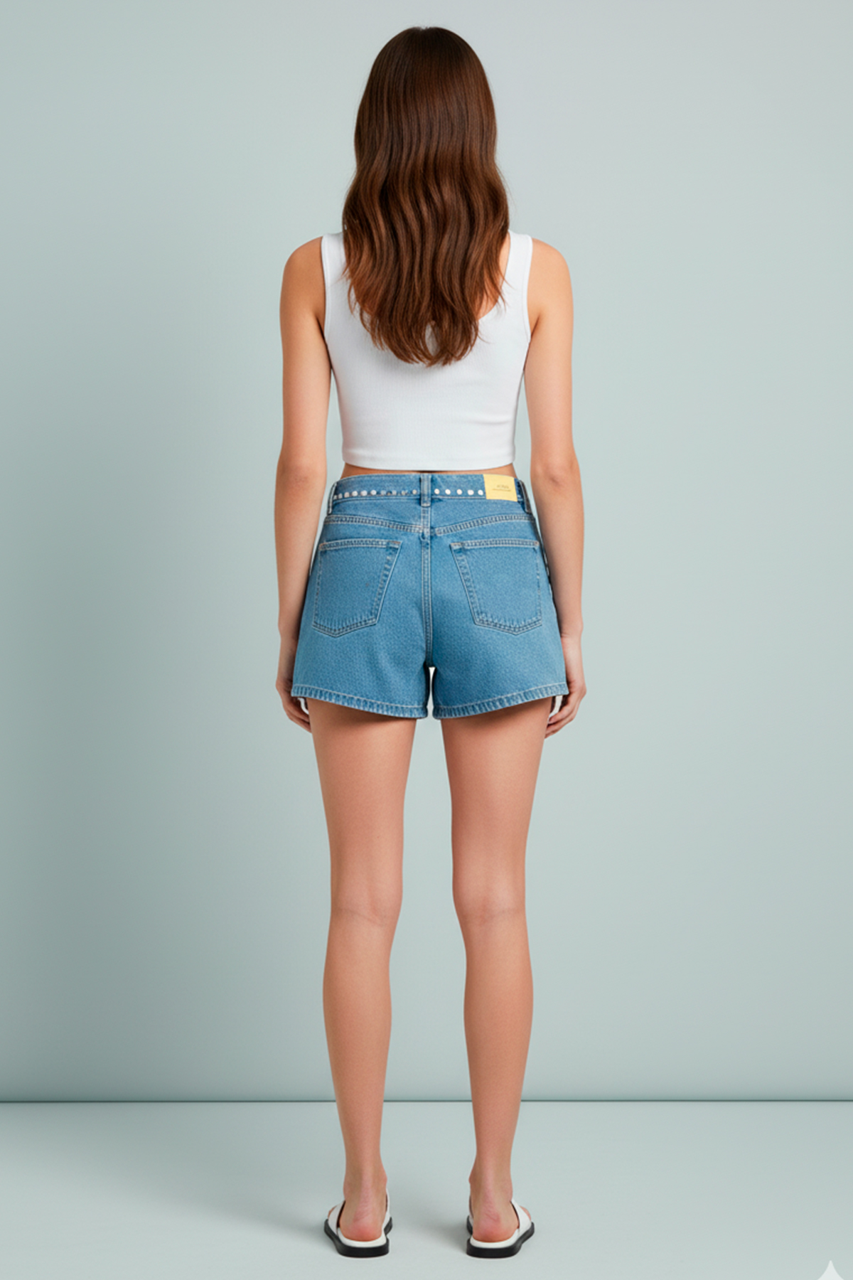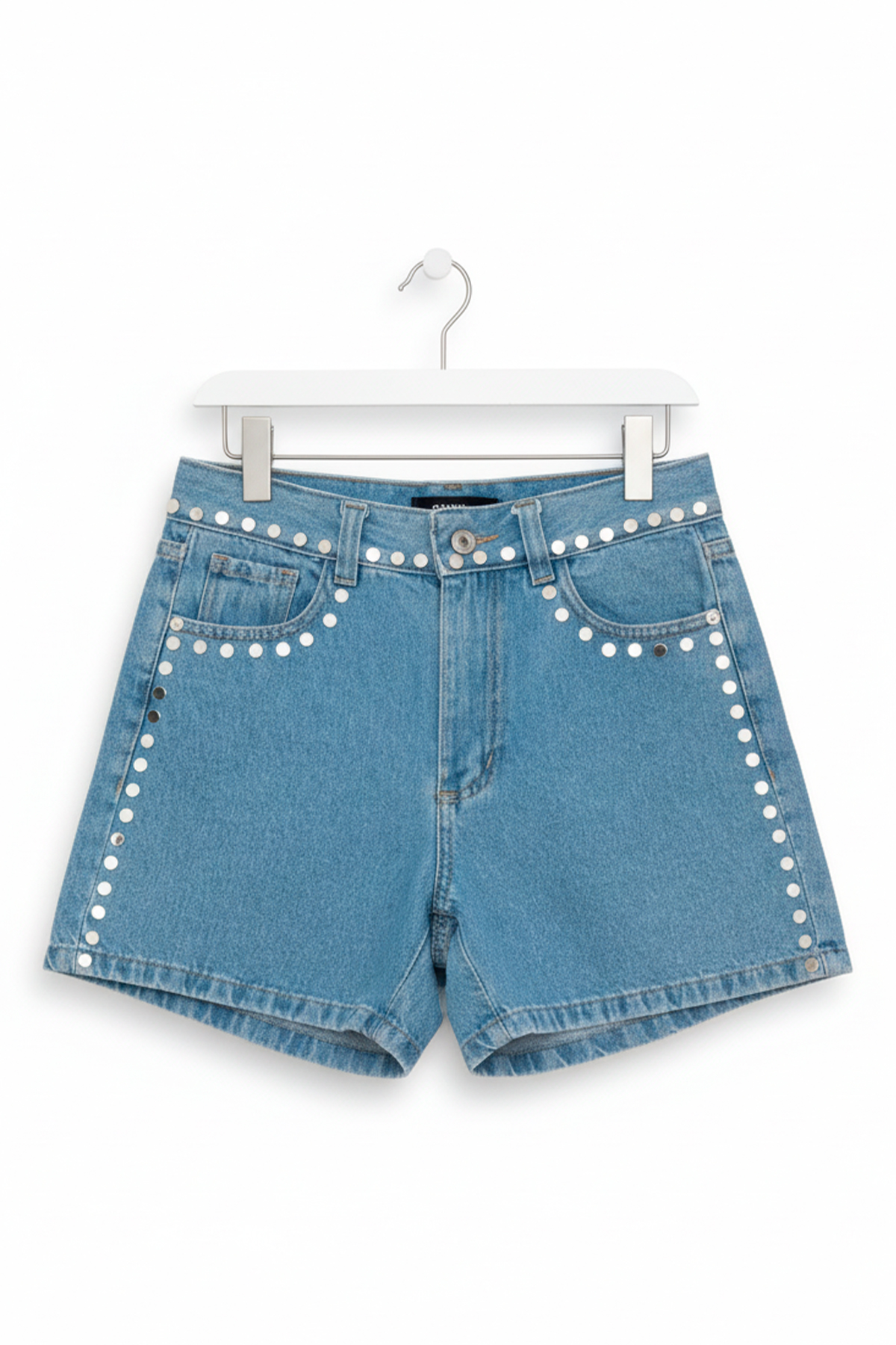 Short mom rigido celeste con strass de tacha en frente y espalda, tiro alto.