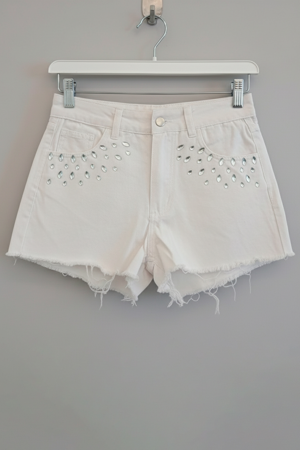 Short clásico blanco de gabardina rígida desflecado con piedras en el frente. Tiro alto.