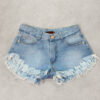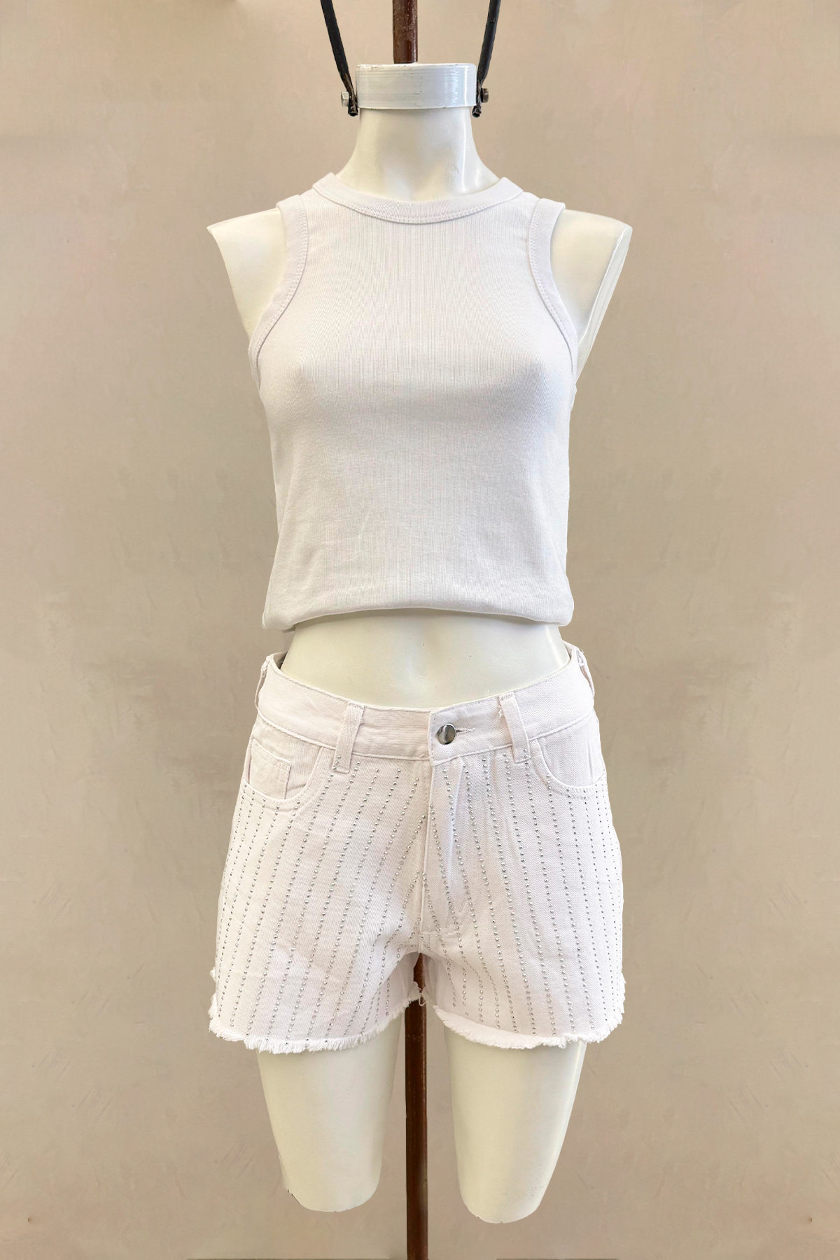 Short blanco desflecado de gabardina rigida con strass plateado en el frente.