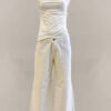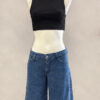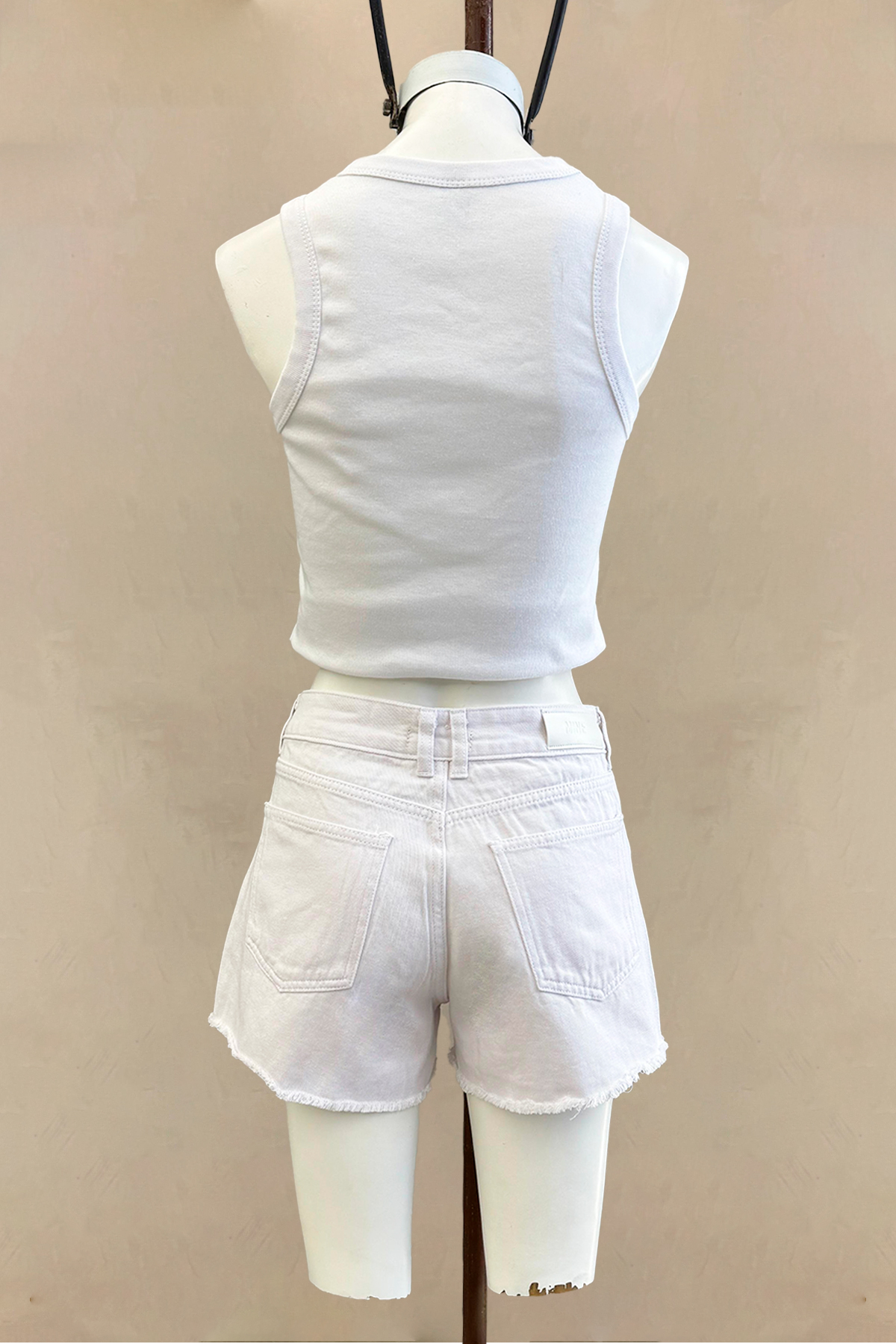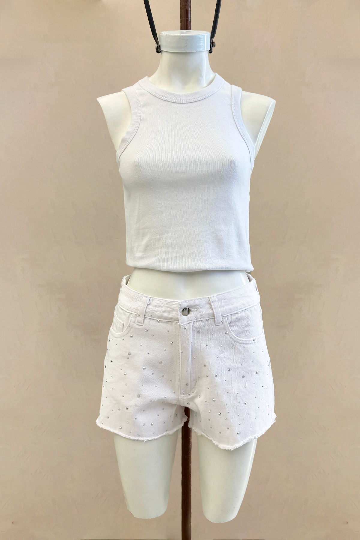 Short blanco desflecado de gabardina rigida con strass plateado en el frente.