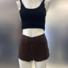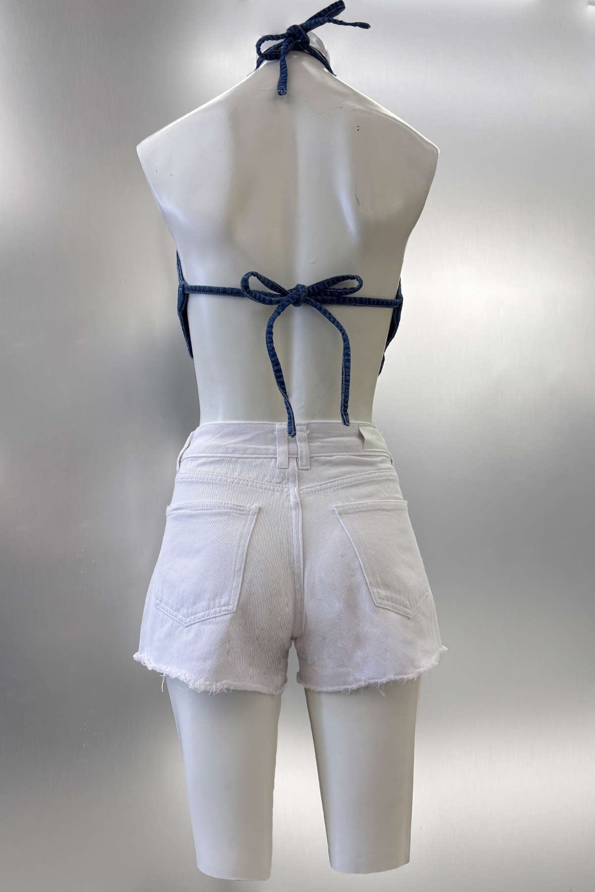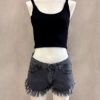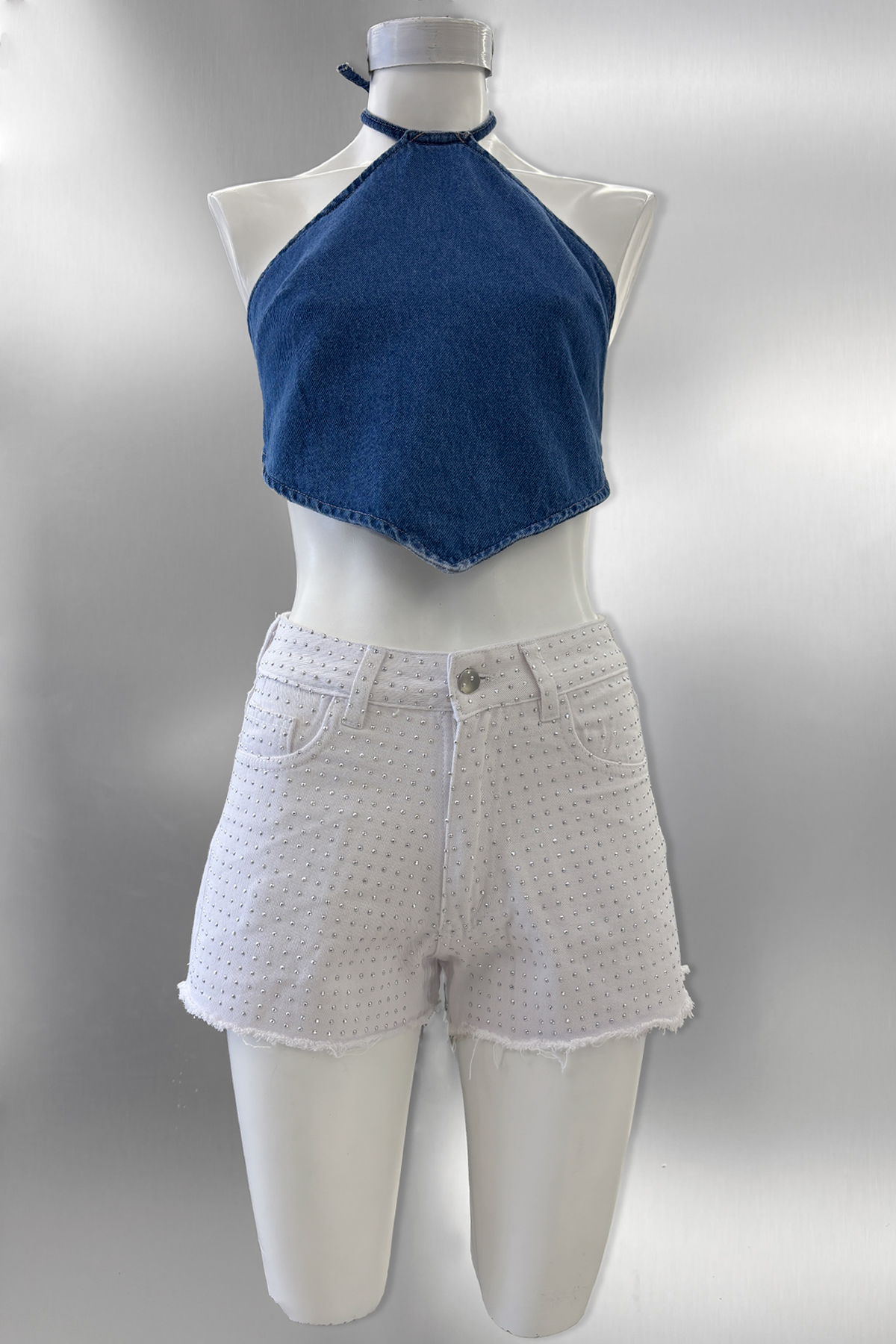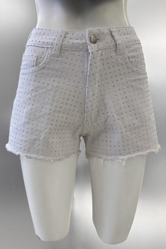 Short de gabardina rígido blanco con ruedo desflecado y strass en el frente, tiro alto .