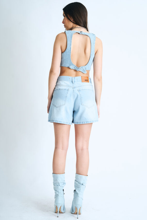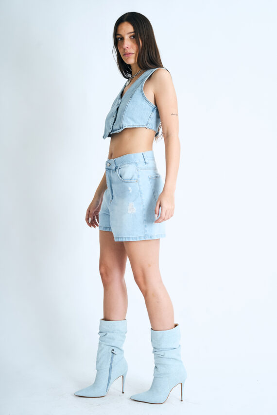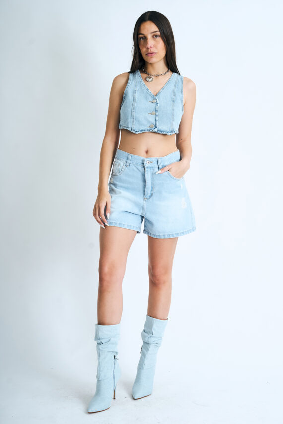 Short mom rígido celeste con roturas y localizado, tiro alto.