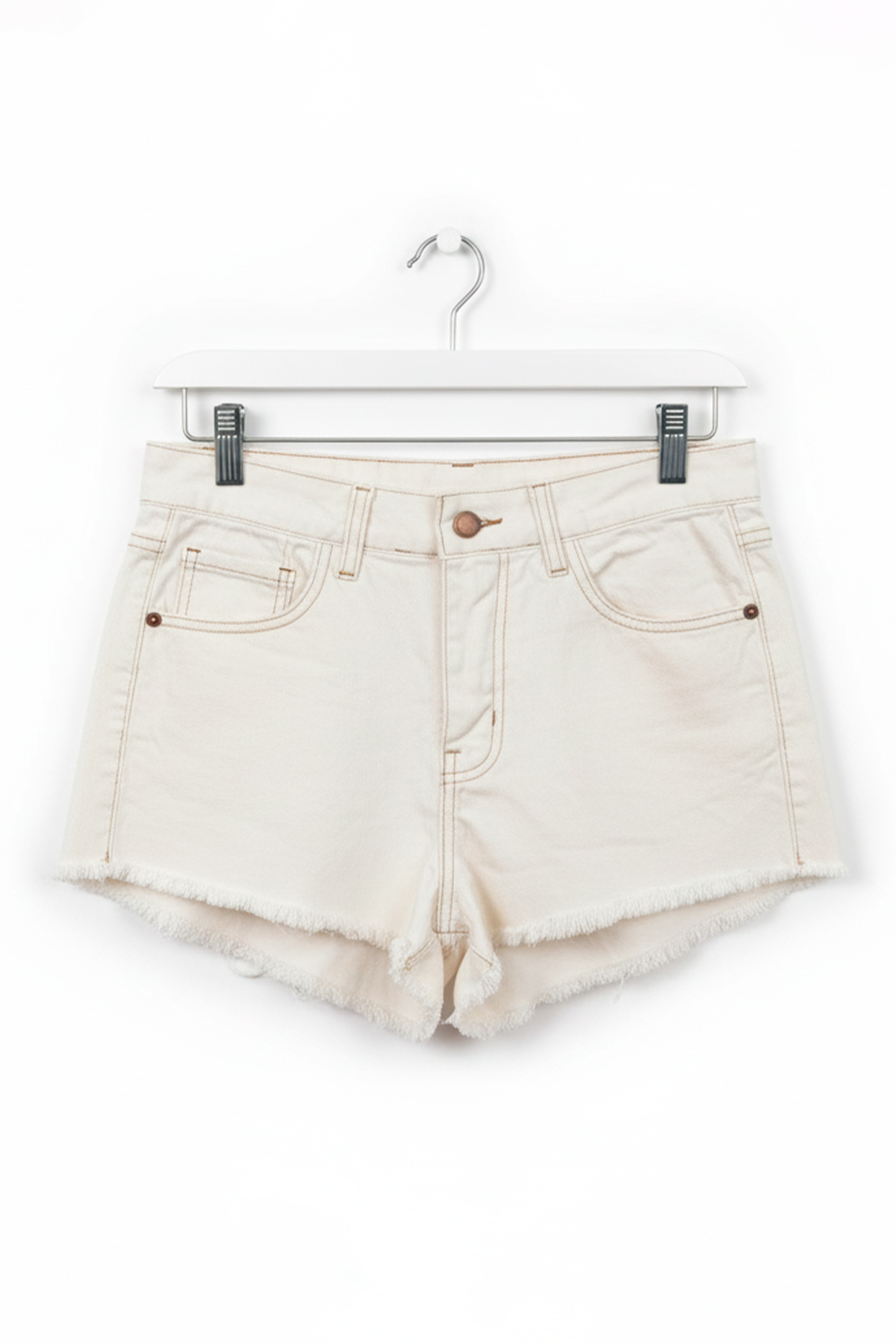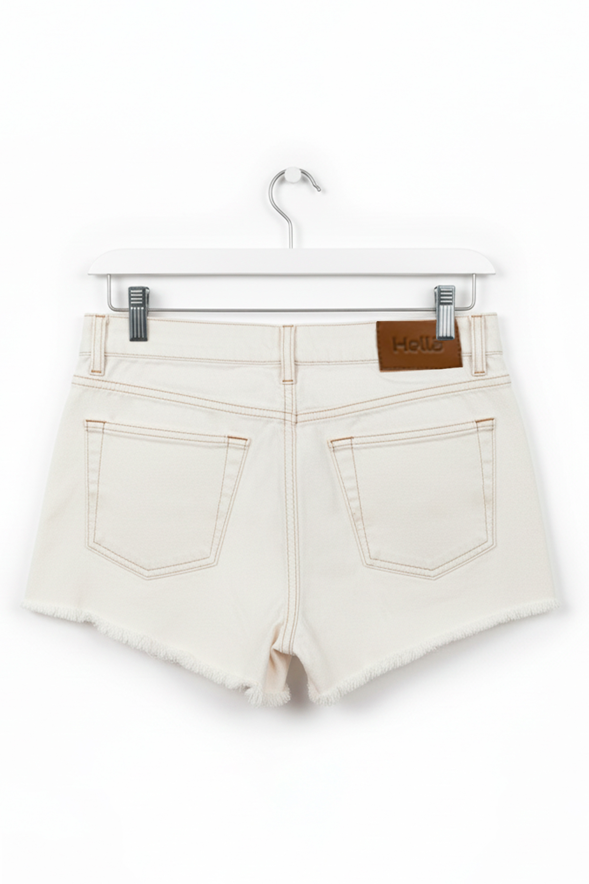 Short clásico de gabardina crudo rígida desflecado con hilo beige. Tiro alto.