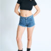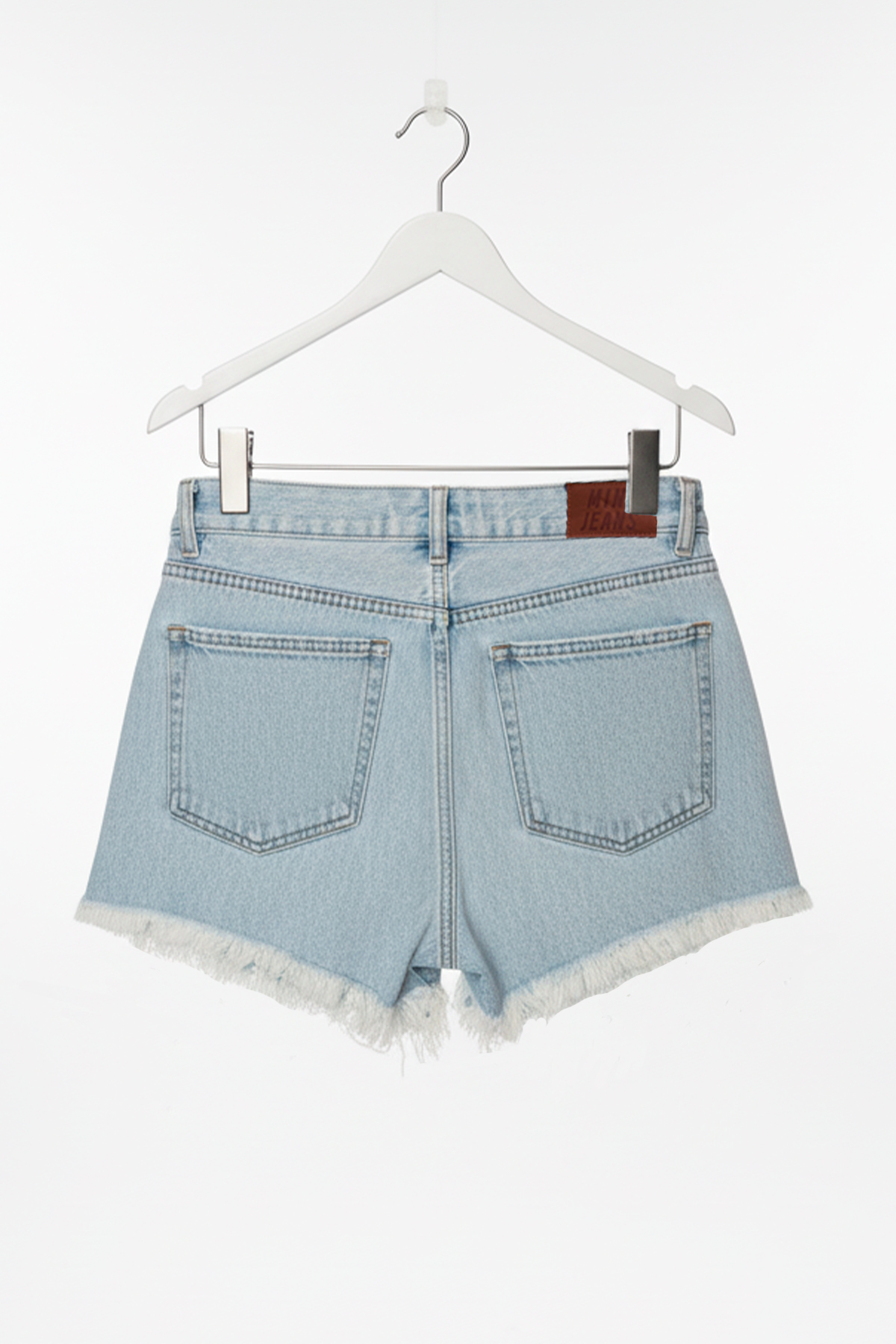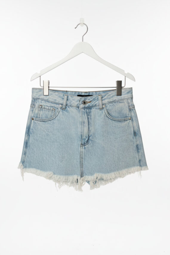 Short pollera de jean celeste rígido desflecado, tiro medio.