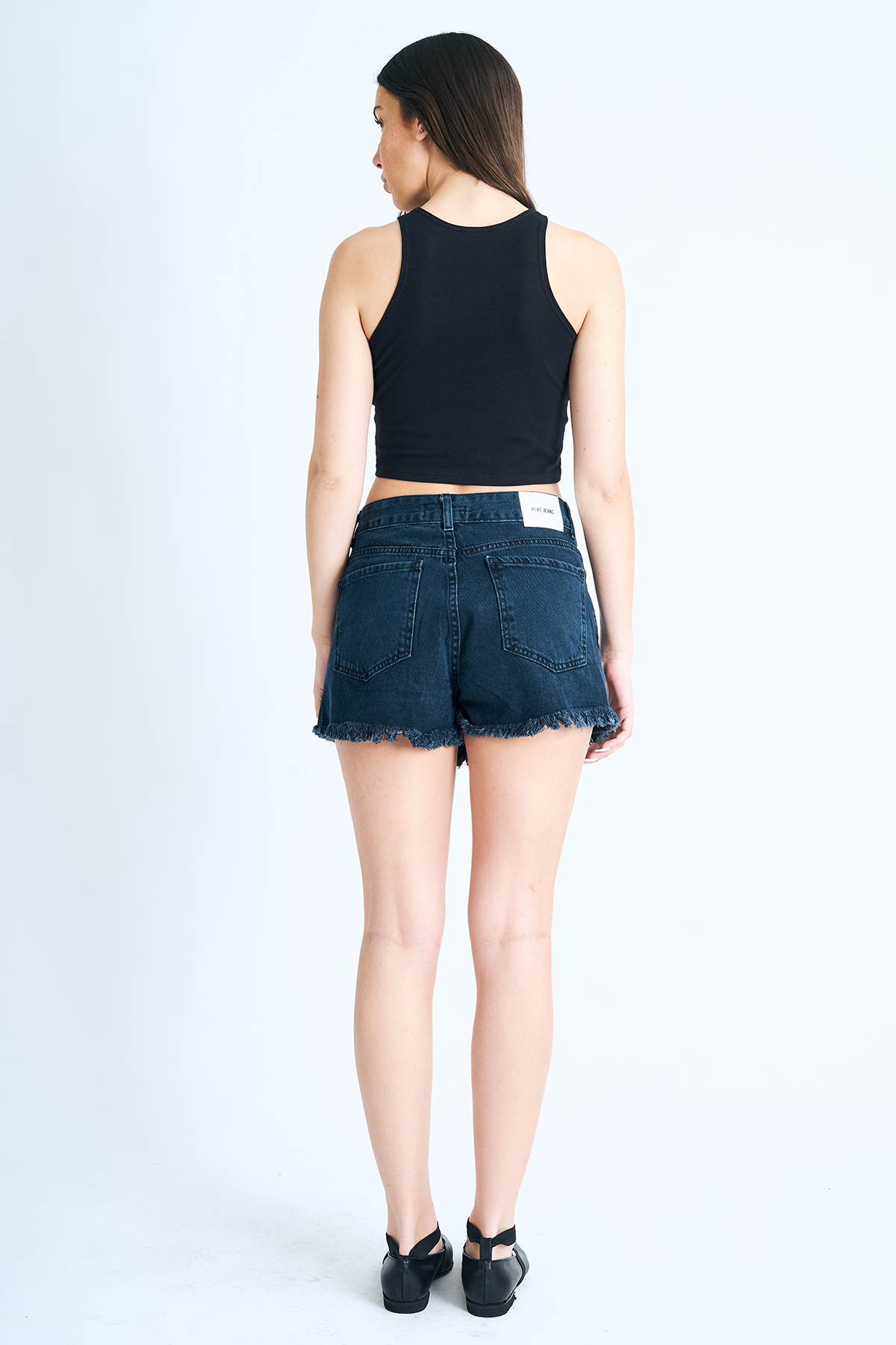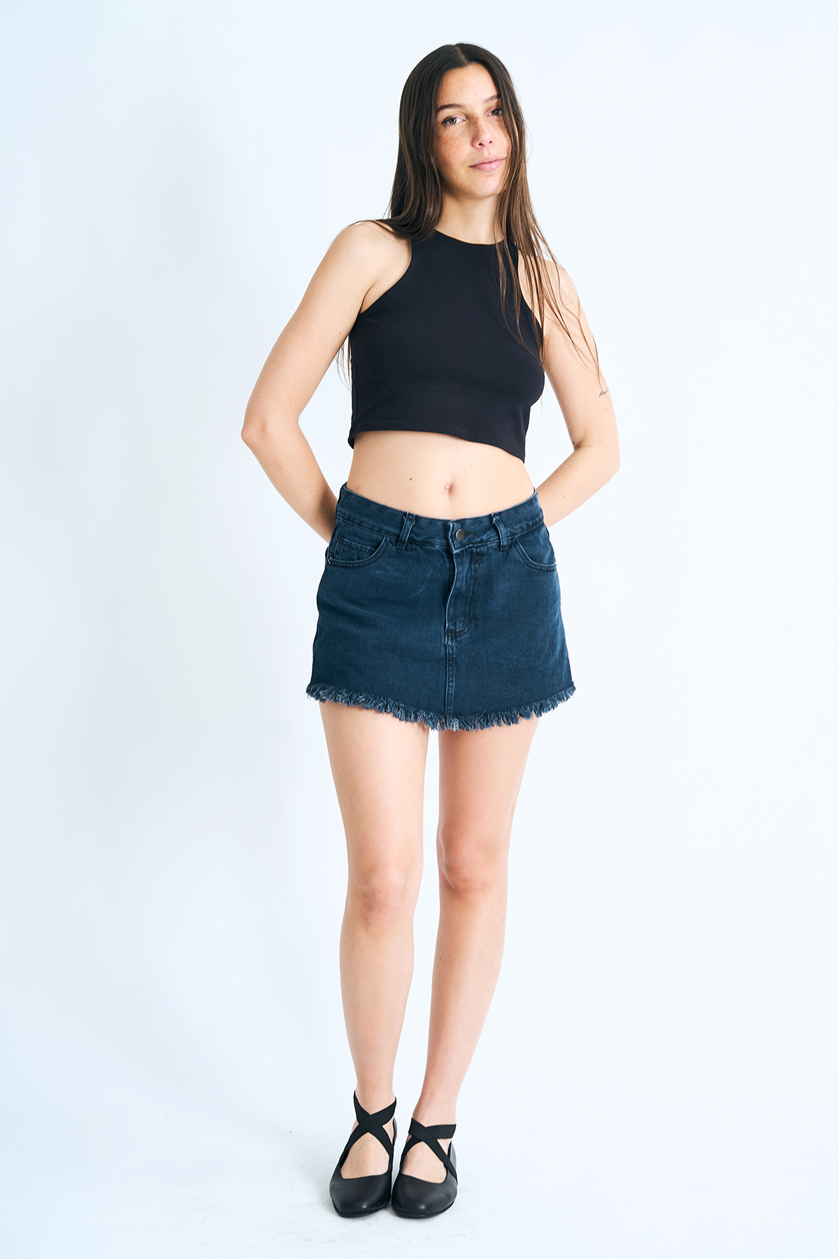 Short pollera rígido desflecado.